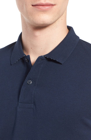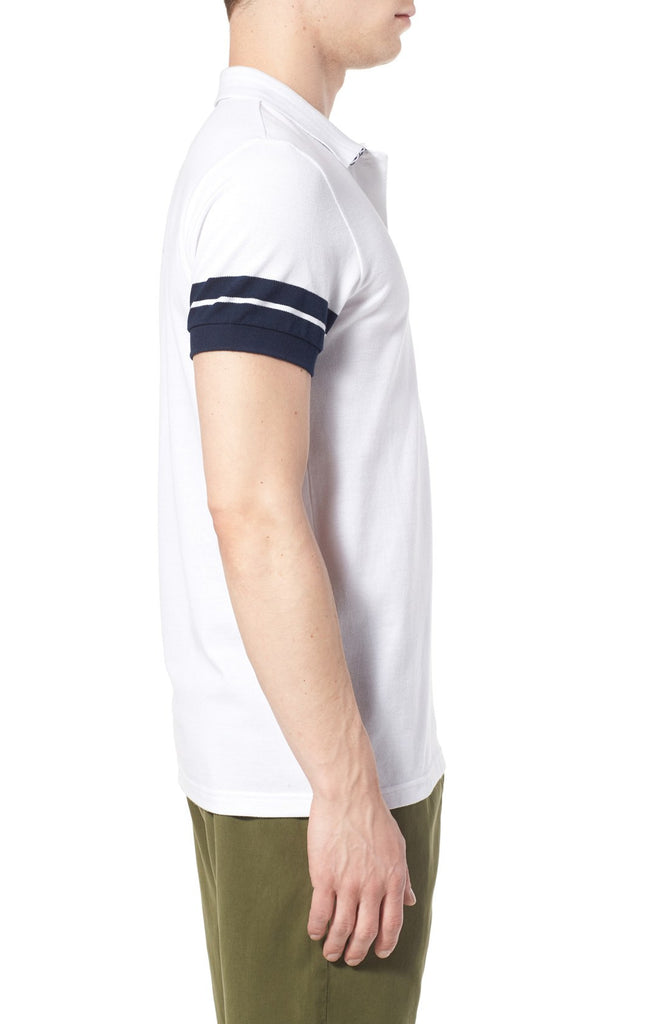 - Striped sleeves add a sporty, nautical vibe to a slim cotton-piqué polo detailed with a coordinating design hidden under the collar.
