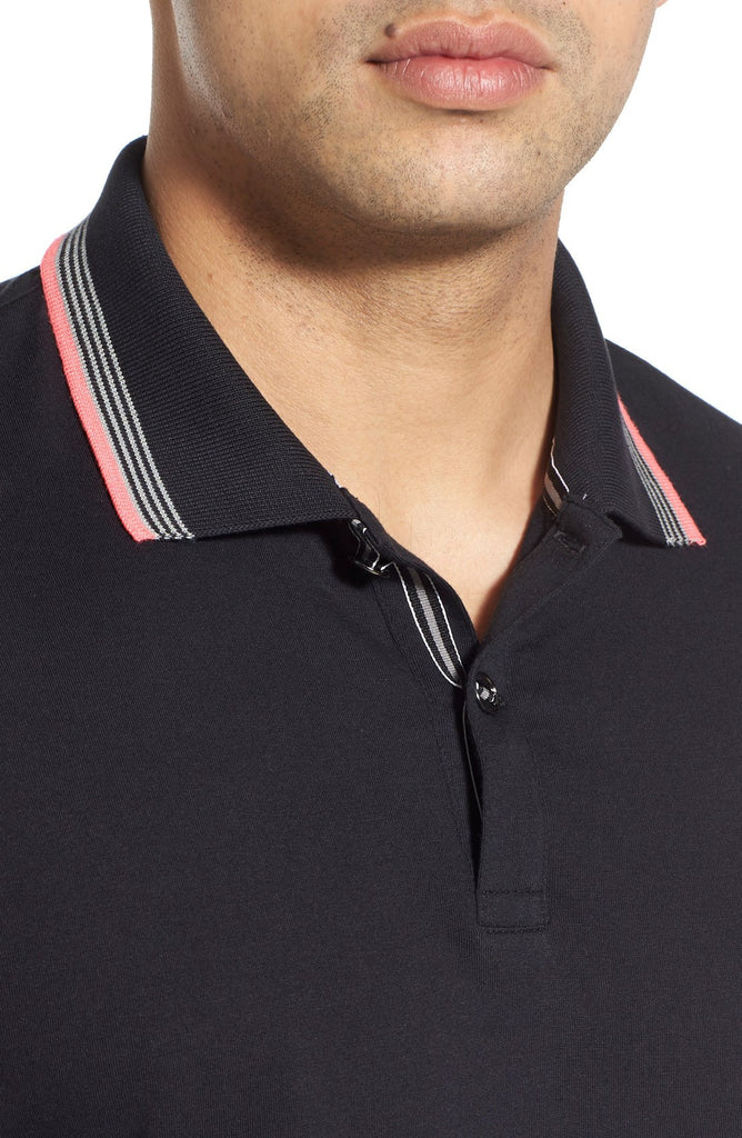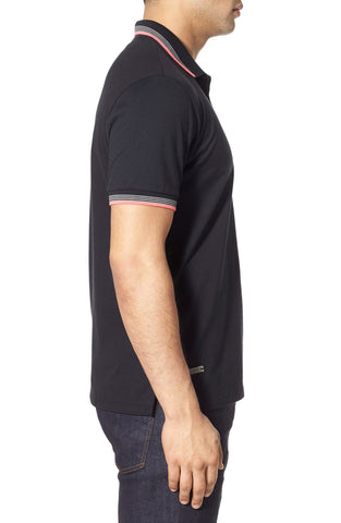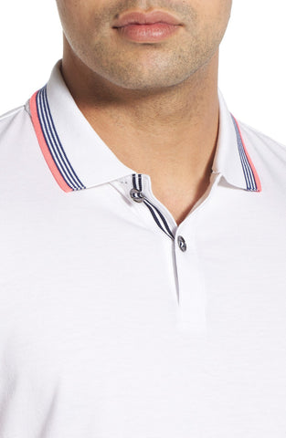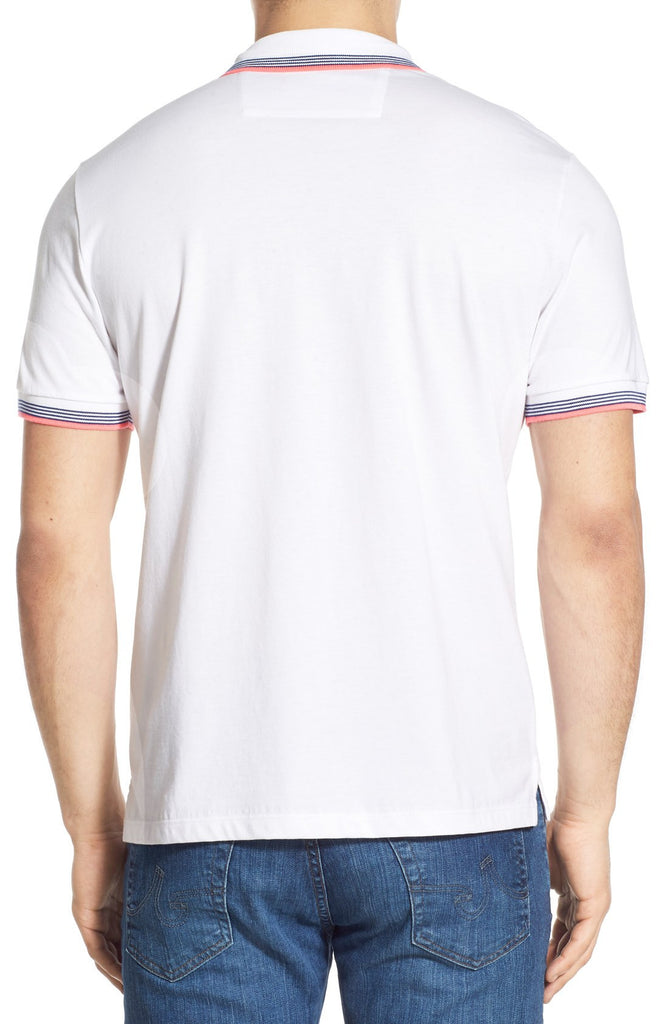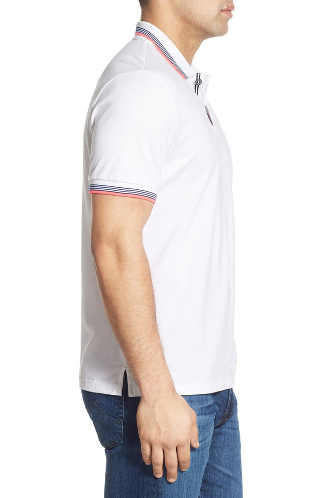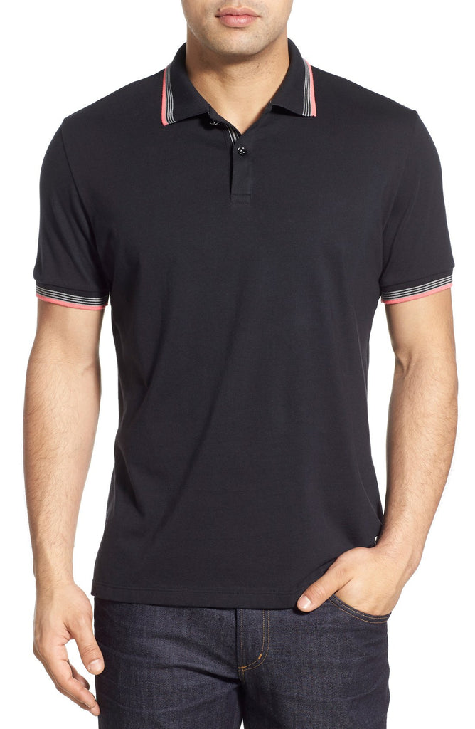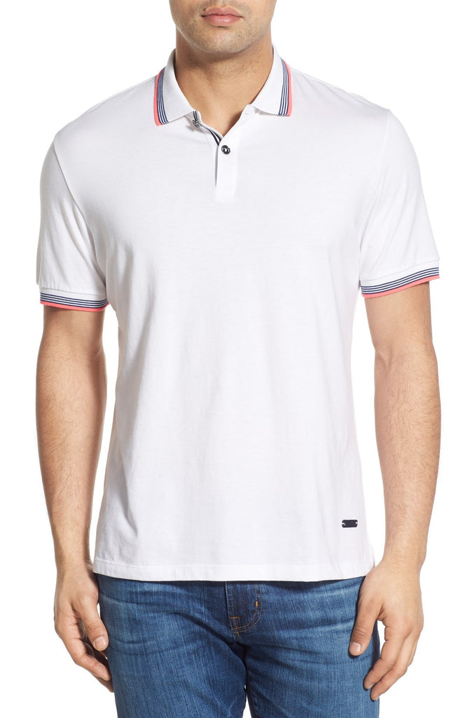 - Stripe-tipped ribbing and grosgrain ribbon trim accent a sharp short-sleeve polo shirt made from soft Peruvian cotton for a clean, casual style.
