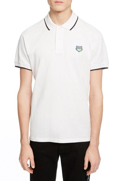 - An embroidered tiger appliqué brands the chest of a soft, piqué-woven polo highlighted with a contrast-tipped spread collar and banded cuffs.