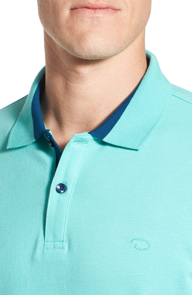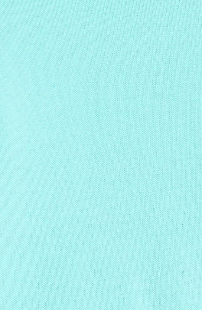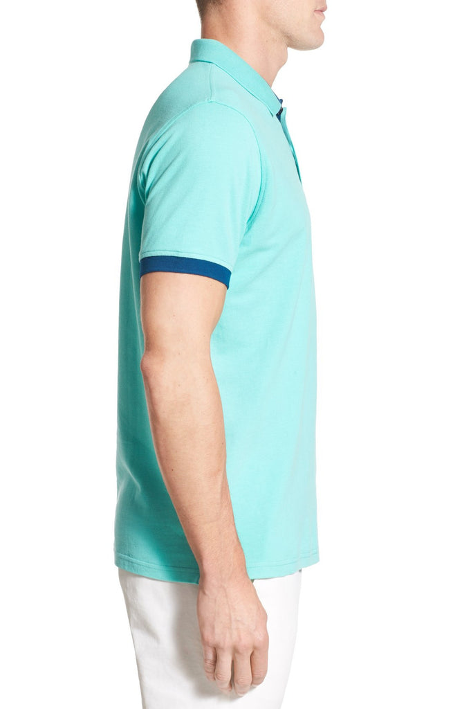 - Navy ribbed trim and color-tipping accent a bright aqua polo knit from soft, breathable piqué-cotton.