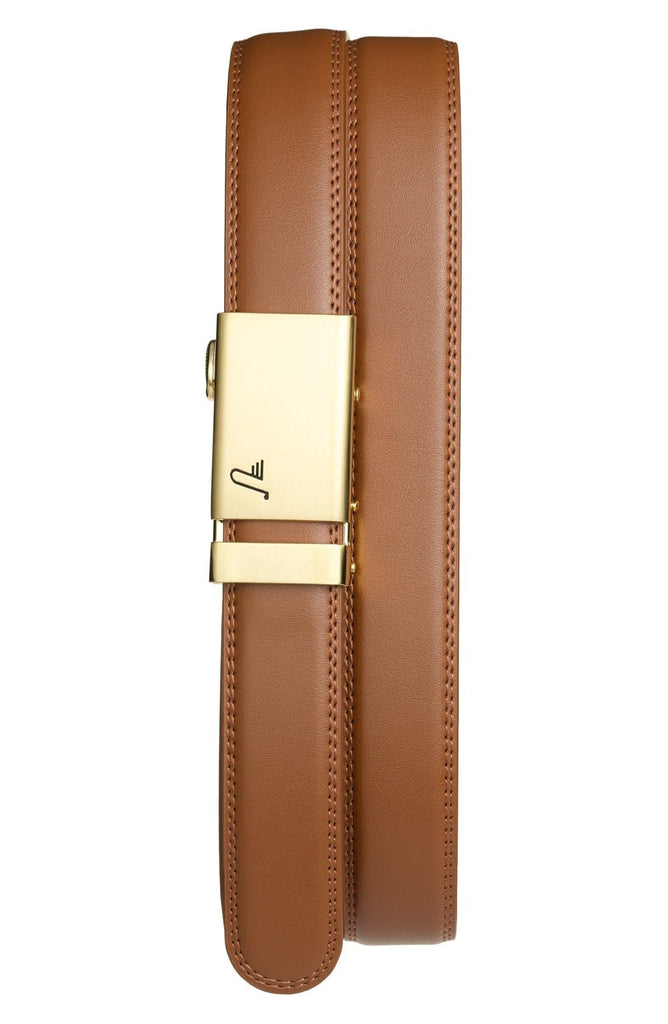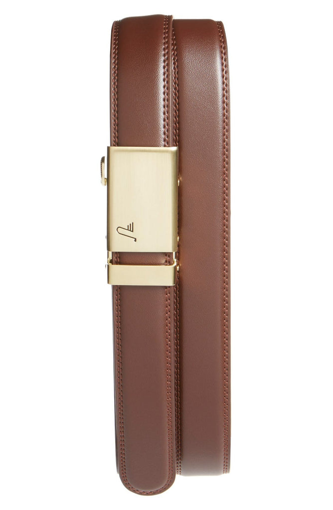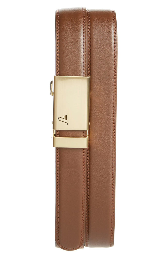 - An innovative ratchet buckle ensures a custom fit in a sleek belt shaped from finely grained leather.