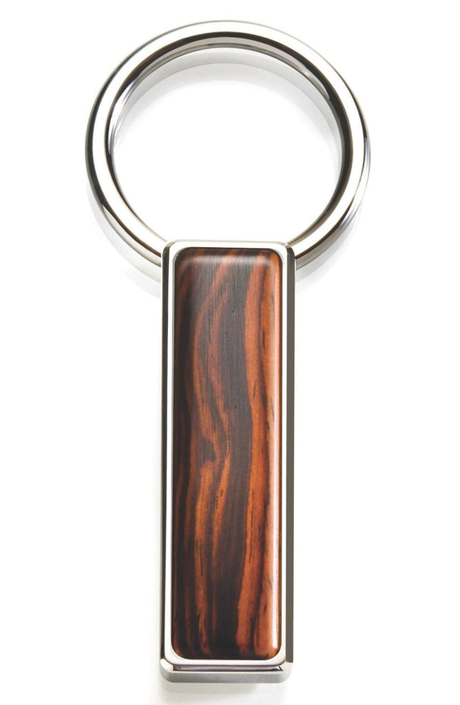 - A meticulously finished wood inlay accents a sharp key ring crafted from high-shine steel.
